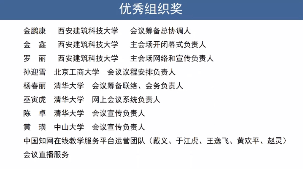 根据《水处理与回用专业委员会奖励办法》的相关规定,在两天的会期里,经各分会场召集人推荐、奖励工作组评选、常委会批准等工作程序,按照鼓励年轻教师和青年学生的原则,从近300篇会议论文中评出33项第四届水处理与回用学术会议“优秀会议论文奖”。清华大学黄霞教授线上宣读了第四届全国水处理与回用学术会议“优秀会议论文奖”获奖名单,黄教授同时线上宣读了本届水处理与回用学术会议“优秀组织奖”获奖名单,以鼓励我国最新科研成果更好地服务于我国环境保护工作,同时表彰会议各承办单位的辛勤付出与悉心筹备。