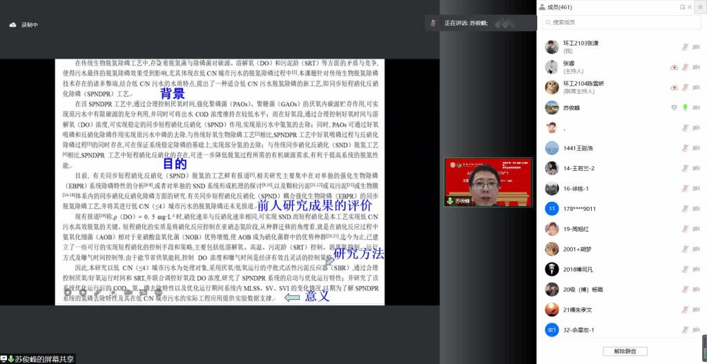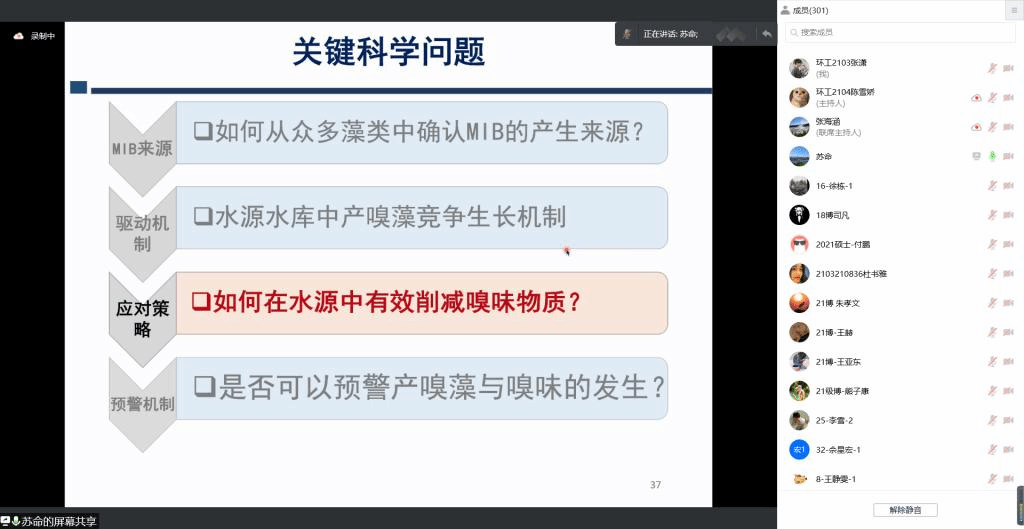 第二期特邀中国科学院生态环境研究中心副研究员苏命老师担任主讲嘉宾。苏老师以《水源产嗅藻识别与控制策略》为题,首先以遍布全球的饮用水嗅味问题为背景,指出MIB主导的土霉味已成为普遍存在的饮用水水质问题;接着他以上海青草沙水库为例,通过建立针对产嗅藻生态位特征的原位调控技术,解决了MIB来源、产嗅藻竞争生长机制、削减嗅味物质、预警产嗅藻与嗅味产生等问题。最后,9001cc金沙以诚为本副院长张海涵教授进行总结,并强调理论研究的终极目标是要落地,将理论转化成生产力、技术来解决一些实际难题,才是研究的根本目的。