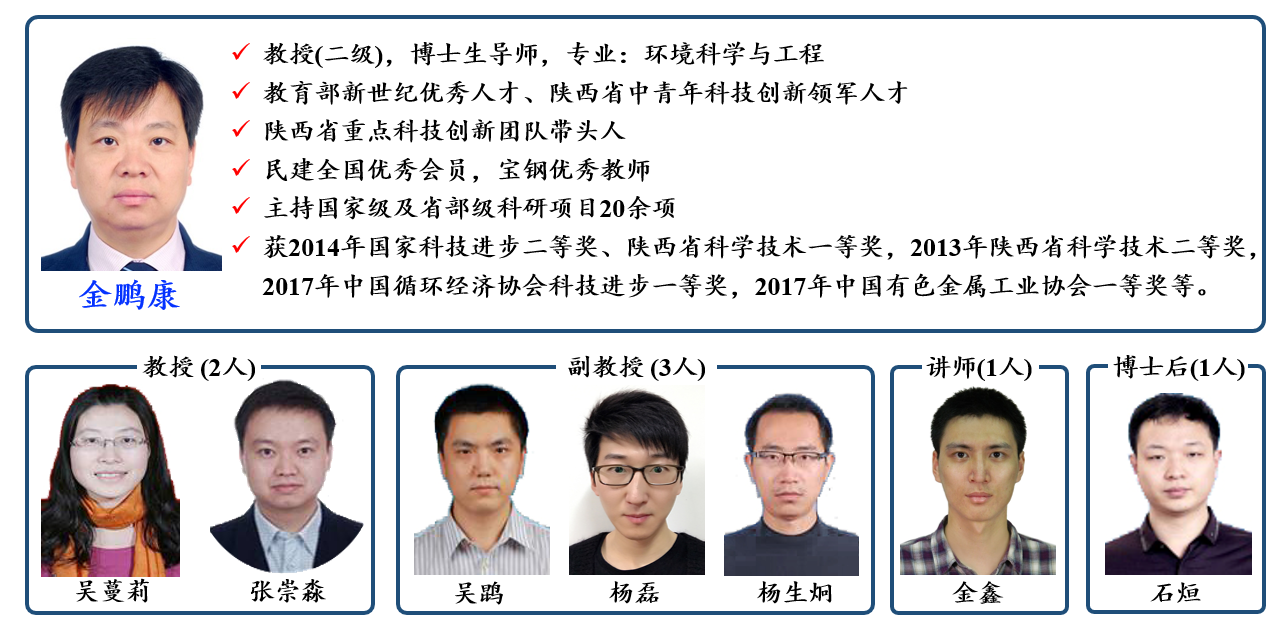 金鹏康教授带领的污水处理与资源化利用创新团队以高级氧化、混凝等多重物化协同生物处理技术为主线,结合主持的8项国家级、十多项省部级和一批大型企业项目研究,发现了污染物传质、转化、降解的物化-生化耦合作用机制,开发了一系列污废水高效处理与资源化利用技术。团队长期致力于成果转化与应用:开发的“模块化处理装置”得到曲久辉院士赞赏,开辟了“油田污染治理新方向”;开发的“臭氧气浮技术”获中国专利优秀奖,得到付贤智院士赞誉;在城镇水污染治理领域,注重挖掘污水厂自身碳源和优化传统技术,得到张杰和侯立安院士赞赏;技术应用于油气田、印染和冶金等行业污染治理以及滇池、太湖、渭河等流域20余座污水厂升级改造。近5年来,在Environmental Science & Technology、Water Research等SCI一区期刊发表论文16篇,在《中国环境科学》、《环境科学》等国内知名期刊发表论文66篇,出版专著3部,授权国家发明专利18项、软件著作权1项。获国家科技进步二等奖1项,陕西省科学技术一等奖、二等奖和中国专利优秀奖、中国循环经济协会科学技术一等奖、中国产学研合作创新成果优秀奖、中国有色金属工业科学技术一等奖和中国专利优秀奖各1项。